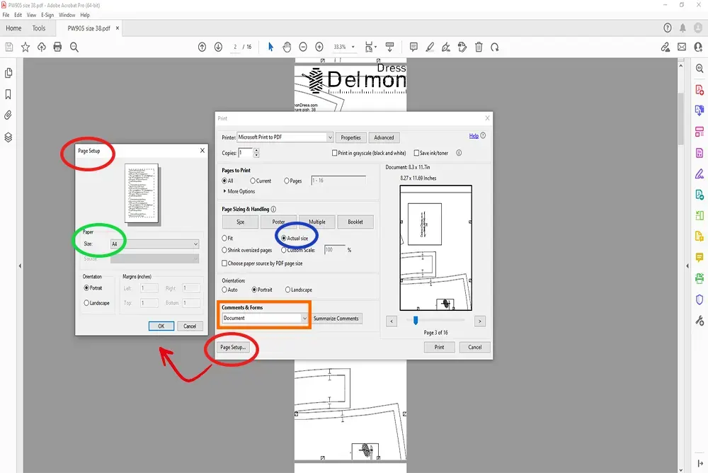 شما فایل PDF برای چاپ که در ابعاد A3 یا A4 است دریافت می کنید. فقط نکته این است که در یکی از صفحات این فایل یک مربع 10 در 10 سانتی متر قرار گرفته که شما ابتدا باید تنظیمات پرینتر خود را بر روی تنظیماتی که در عکس زیر قرار دارد بگذارید بعد از پرینت این صفحه مربع را با خط کش اندازه بگیریداگر درست بود ،می توانید بقیه صفحات را نیز پرینت بگیرد (در اینصورت است که اندازه الگو صحیح است .)